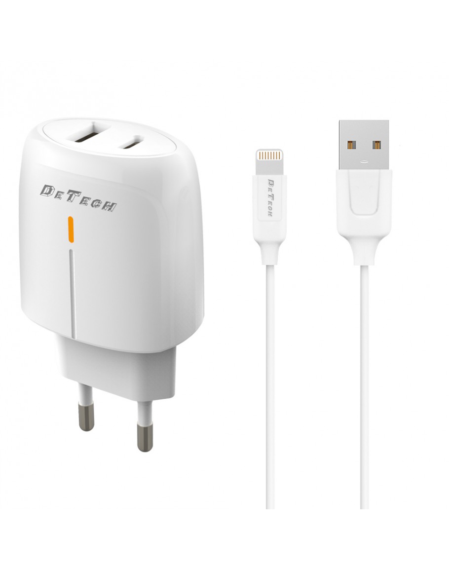 Мрежово зарядно устройство DeTech DE-31i, 20W, С Lightning кабел, 1 x Type-C F, 1 x USB F, PD, QC, Бял - 40320