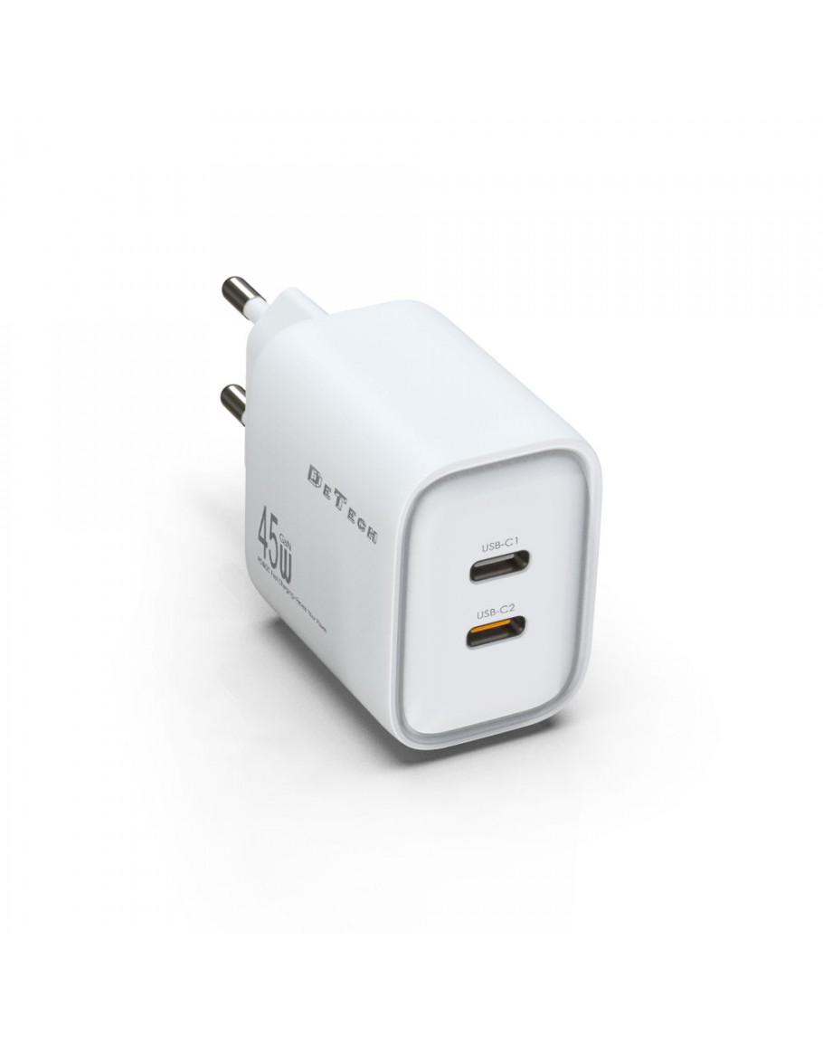 Мрежово зарядно устройство DeTech DE-PD, 45W, GaN, С Type-C кабел, 2 x Type-C F, Бял - 40341