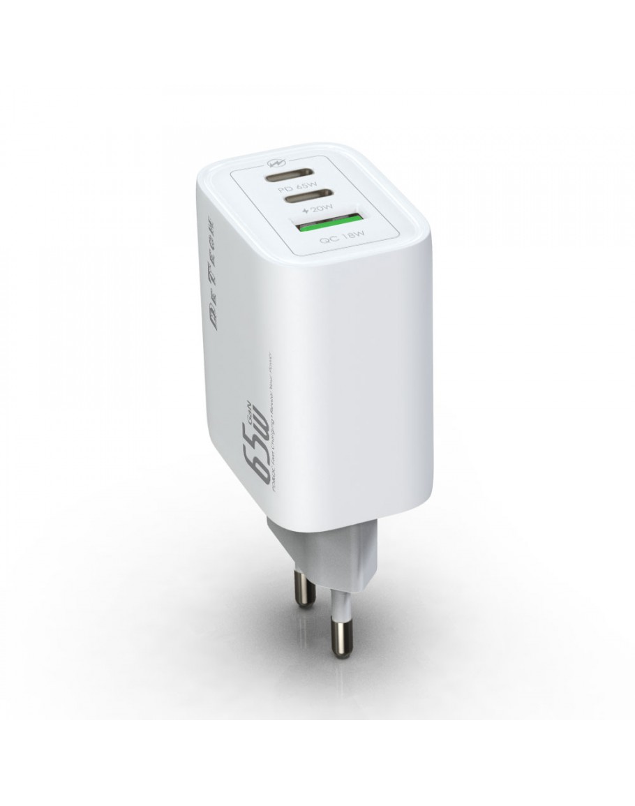 Мрежово зарядно устройство DeTech DE-PD, 65W, GaN, 2 x Type-C F, 1 x USB F, Бял - 40342
