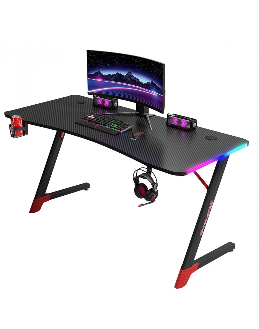 Геймърско бюро 4 в 1 включва поставка за чаша, кука за слушалки и RGB осветление.